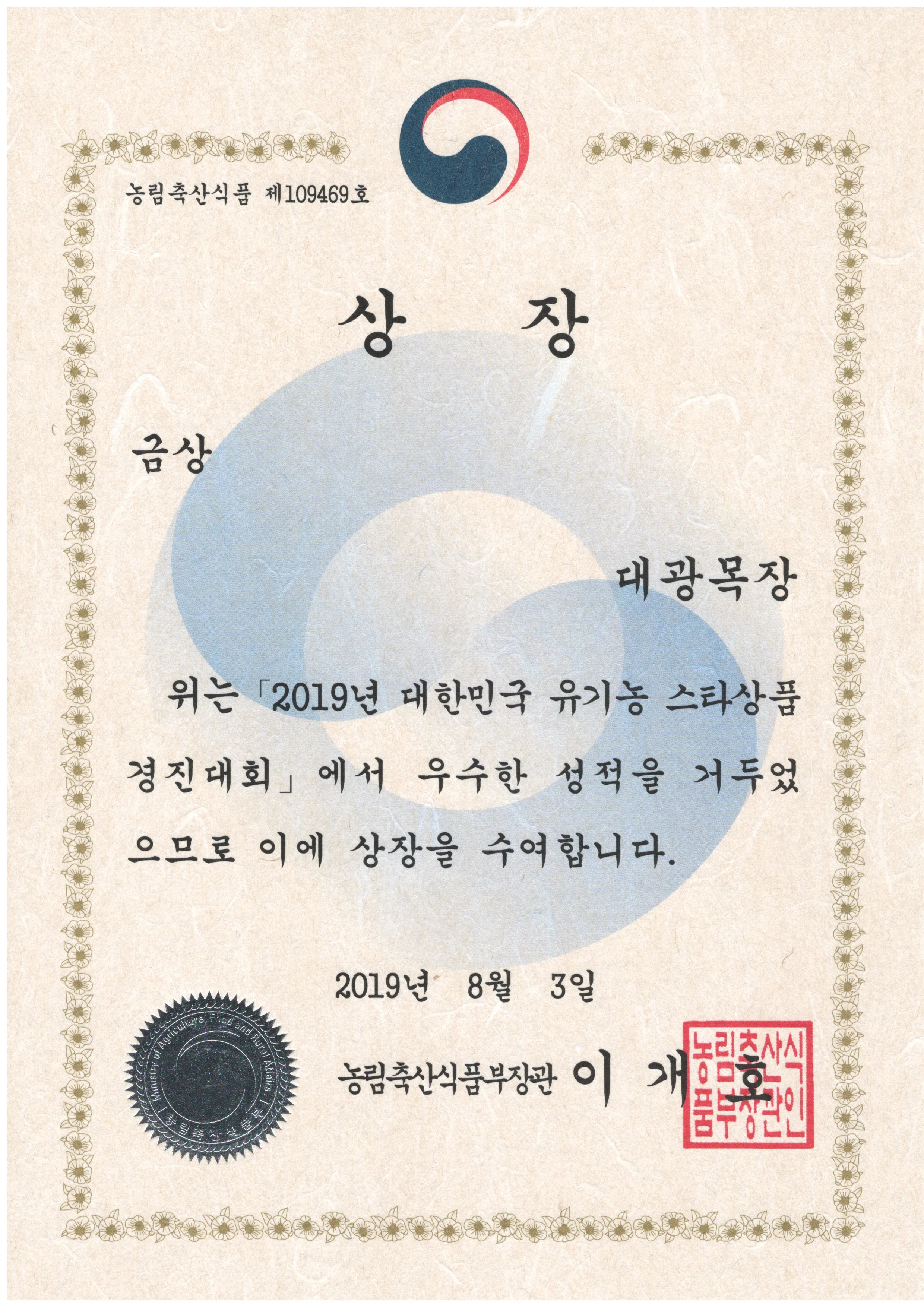 대한민국 유기농 스타 상품 경진대회 농림축산식품부 장관상 수상