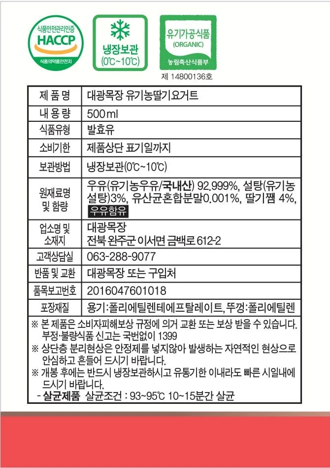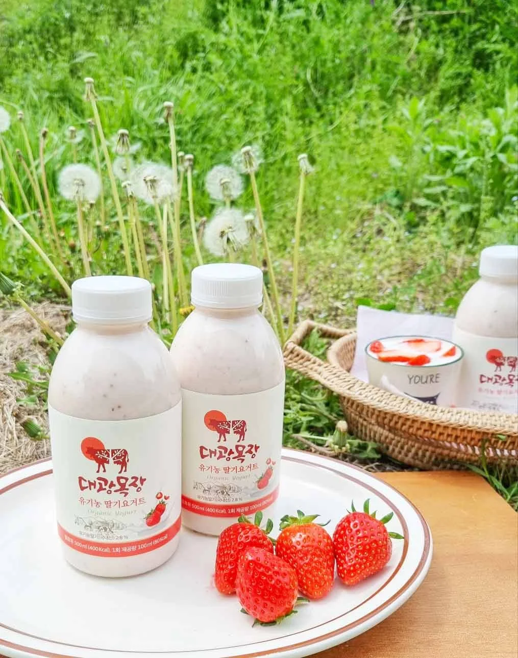 대광목장 요구르트는 일체의 화학첨가물을 넣지 않은 100% 유기농우유만으로 만들고 , 오직 유산균과 장내 유익균 증식에 필요한 3%만의 유기농 설탕이 들어있습니다. 새롭게 출시된 대광목장 딸기요거트는 기존의 부드럽고 담백한 요거트에 딸기잼을 첨가하여 상큼하고 달콤한 맛을 더했습니다. 목장에서 이른새벽 갓 짠 우유로 10여분 내에 만들어지고, 저온 발효 기술을 통해 1ml당 1억마리의 유산균이 살아있는 신선하고 건강한 식품입니다.
